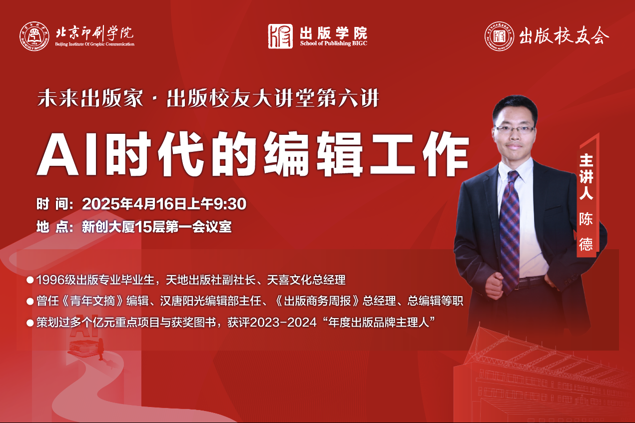 主講人:陳德,北京印刷學院2000屆出版專業畢業生,天地出版社副社長、天喜文化總經理。曾任《青年文摘》編輯、漢唐陽光編輯部主任、《出版商務周報》總經理、總編輯等職。策劃過多個過億元重點項目與獲獎圖書,獲評2023-2024“年度出版品牌主理人”。