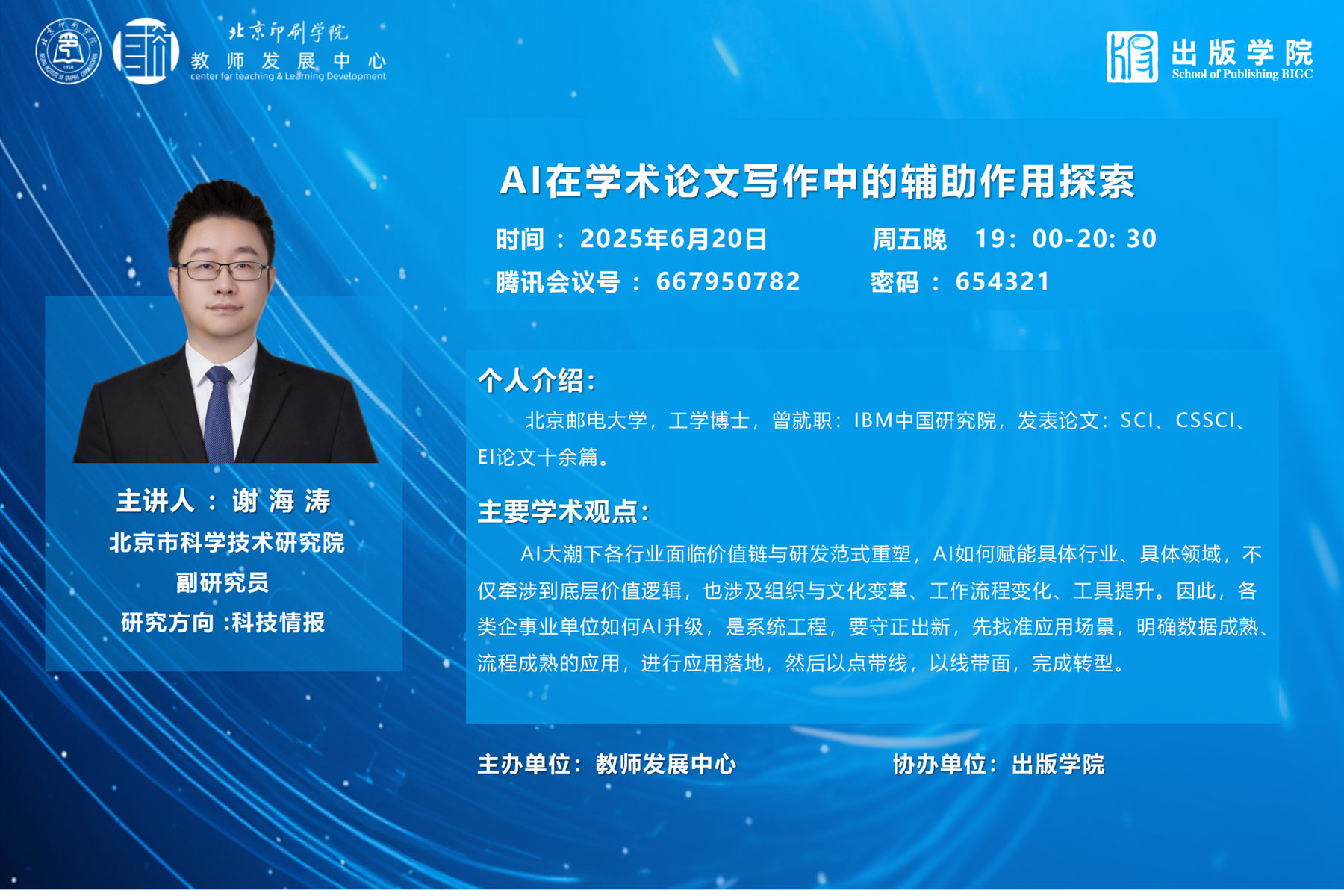 講座人:謝海濤,北京郵電大學,工學博士,曾就職IBM中國研究院,現就職北京市科學技術研究院,副研究員,發表論文:SCI、CSSCI、EI論文十余篇。