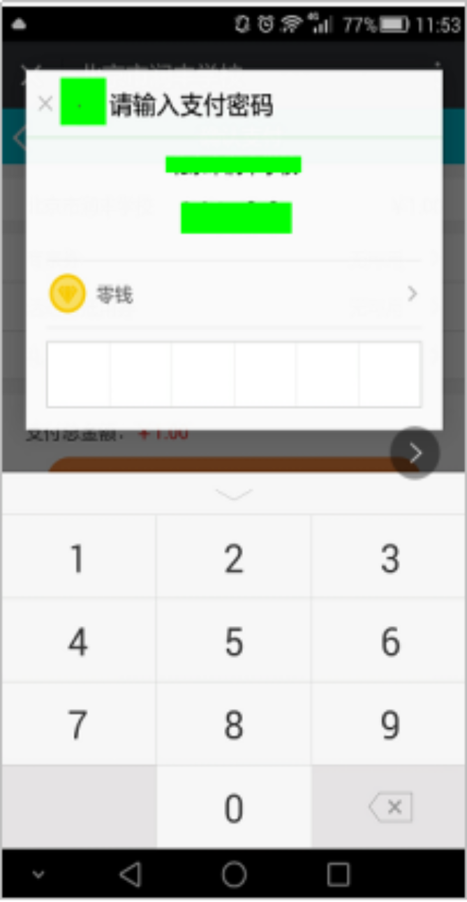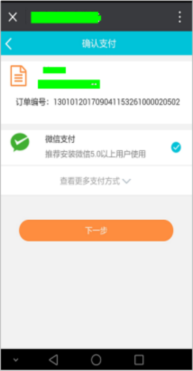第五步:顯示微信支付,點(diǎn)擊“下一步”,輸入微信支付密碼,完成支付。