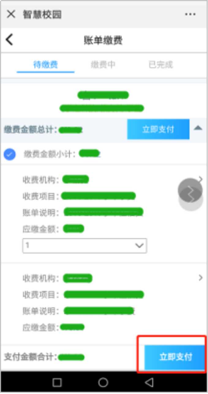 第四步:點(diǎn)擊“賬單繳費(fèi)”,確認(rèn)學(xué)生信息,點(diǎn)擊“立即支付”->“提交”。